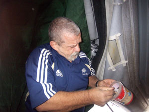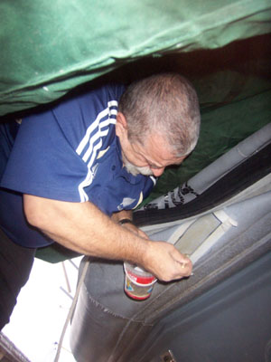 Après le temps de la réflexion, le temps de l’action : Lucien est parti chercher à la Pointe Rouge des nouveaux bouchons d’obturation de ces valves ; après leur changement par notre chef cuistot Jean Michel, la fuite est encore là, moins forte mais toujours là. Un liquide d‘étanchéité pour pneumatique PVC et Hypalon que l’on introduit à l'intérieur du flotteur par la valve de gonflage est peut-être la solution à notre problème, c’est en fait un vernis en émulsion qui recrée une membrane élastique interne obstruant les porosités et les fuites mineures.