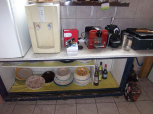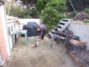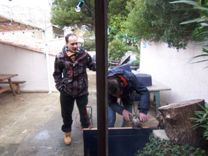 Entre-temps, en cuisine, Frédéric et l’infatigable Lucien mettent en place un petit meuble sous le la plaque de cuisson à coté de la bouteille de gaz pour divers rangements.