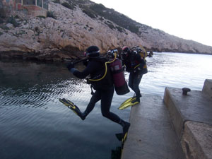 Départ avec le Suscle, piloté par notre Bernard, sur le site de la Grotte du CNRS, où tous les plongeurs vont s'immerger, pour retrouver le bateau sur le site de la Télévision.