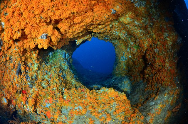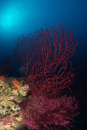 Normalement du fait du courant, la visibilité est limitée. Mais aujourd’hui, nous avons de la chance sur cette première plongée : il est possible de voir les deux côtés de la faille. Aussi je me mets bien au milieu pour essayer de ne rien rater et je me laisse entraîner par le courant. De toute façon, c’est une plongée pour le gros, on n’est pas là pour les nudibranches. Pas besoin de palmer, le courant nous emporte lentement. En apesanteur, on a l’impression de voler …