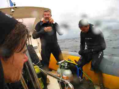 Un Samedi d’été. En ce samedi 14 aout , après une chaleur étouffante de la semaine précédente, nous voici sous la pluie, pour une plongée entre Morses. Comme à l’habitude les préparatifs des bateaux et matériels avant le départ, ont été rocambolesques. Tout d’abord le remplacement et mise en place du filtre décanteur d’essence du "Suscle 2" par notre Lulu national et après de nombreux essais de démarrage, le filtre a été carrément shunté. (voir au prochain épisode ) L’arrivée plus ou moins à l’heure des Morses, (males et femelles ) les préparatifs du matériel personnel, le revêtement de la tenue, bref vous voyez la scène!. Bref nous voici parti sous la pluie pour les moyades. Nous avons pu découvrir le premier point d’ancrage (Photo ci jointe ) Martine accompagné de Frédéric, notre colonel et du grand Philippe (comme le nomme Martine) ont vu paraîit-il: 3 saint-pierre de face de profil et de dos, (il est vrai que le lendemain sera le 15 août l’Assomption ) une murène monumentale, sars, daurades, dentis, etc..( voire un aileron de requin blanc? ). Notre retour toujours sous la pluie, avec de nombreuses discutions sur la plongée et à vitesse réduite avoisinant les 5 à 6 nœuds et pourtant c’était Lulu qui pilotait. Cette nouvelle aventure c’est terminée comme à l’habitude par de longues discutions autour d’un apéritif et d’un repas barbecue, pris en commun et toujours sous la pluie . Le ciré était de rigueur. (photo jointe ) Jean-Claude Eugène |