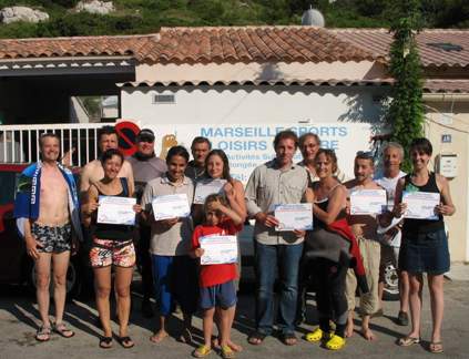 La section plongée de Marseille Sports Loisirs Culture, basée à Callelongue, a procédé aux premiers baptêmes de plongée de l’été. Ces sept baptêmes ont eu lieu dans la calanque des Monastériaux à l’île de Riou, par l’encadrement bénévole du club. Peut être que ces nouveaux initiés dont le plus jeune Vincent huit ans et la plus âgée Myriam trente huit ans, seront-ils un jour des plongeurs passionnés, comme ceux qui les ont baptisé?…. |