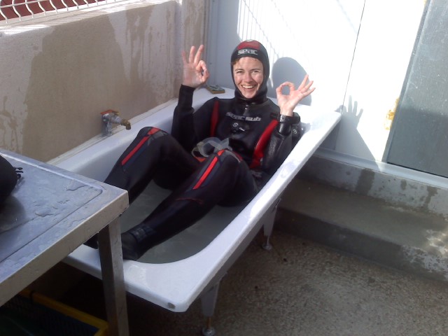 Après avoir joué un rôle dans "Plongée Baignoire" un film de JC EUGENE, notre BEES 2 s’entrainerait-elle pour aller retrouver Nicolas HULOT dans les tuyaux d’USHUAÏA ? L’équipe des Morses de Callelongue, lui souhaite de réussir cet exploit qui sera relayé dans le monde sous marin par notre "Télé Potin, notre Télé du matin" en espérant quelle ne s’égare pas dans le siphon de la baignoire, voire du lavabo ou plus encore dans celui des WC. Bon courage Marie Laure!……